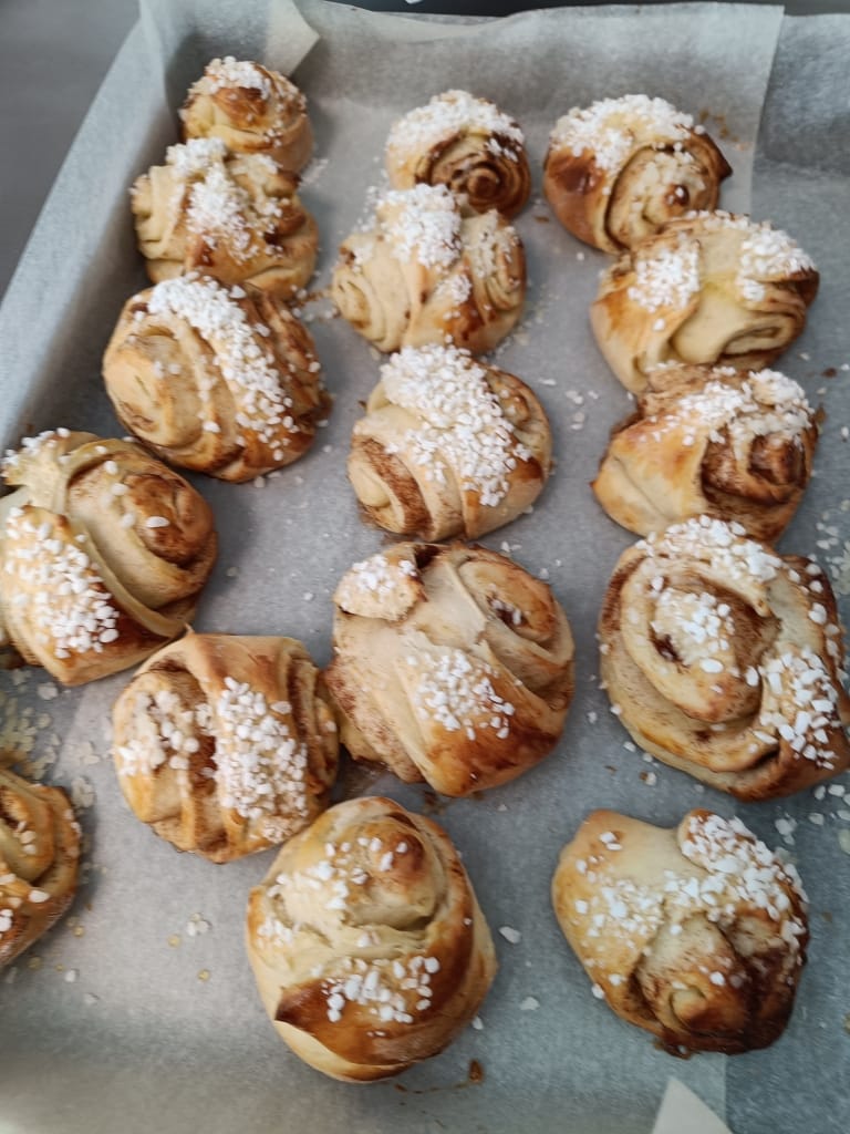 Herkuttelimme uunituoreilla korvapuusteilla 4.10 päiväkahveilla koko talon väen kanssa.