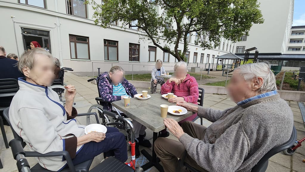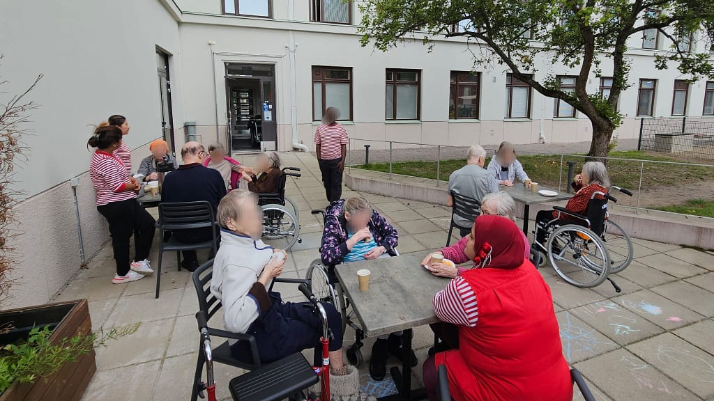Järjestetty iltapäiväkahvit ensimmäisen kerroksen terassille. Joi kahvia söi keksejä ja sipsejä. Kuuntelin musiikkia ja juttelin muiden asukkaiden ja hoitajien kanssa.