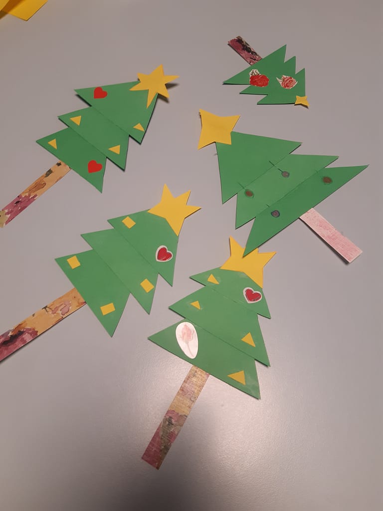 Jouluvalmistelut hyvissä ajoin. Asukkaat tekivät joulukuusen värikkäästä paperista.