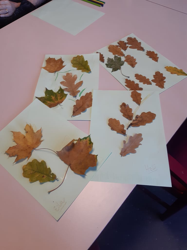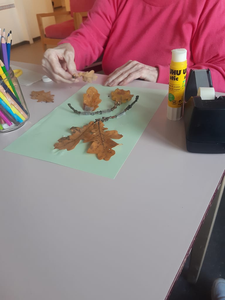 Asukas nautti askartelua lehtien avulla.