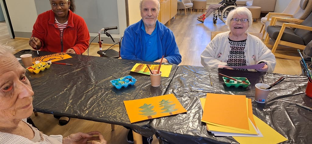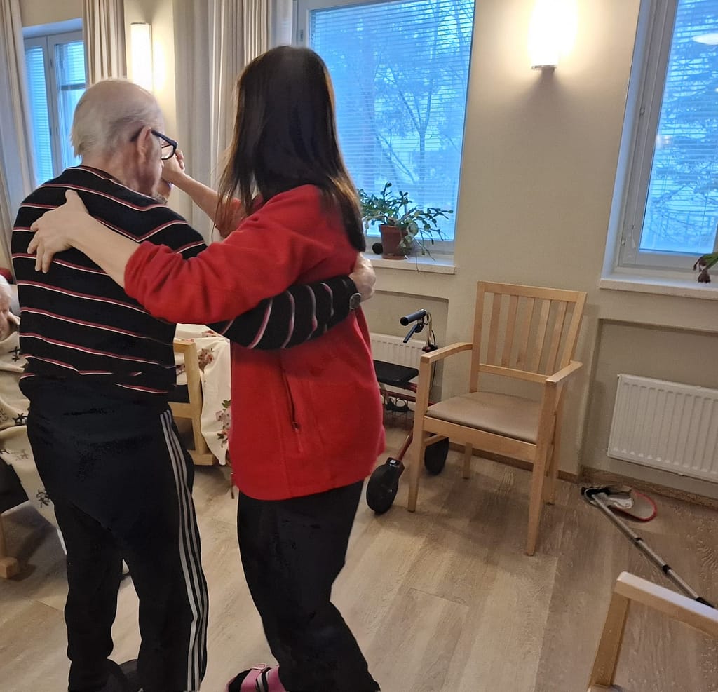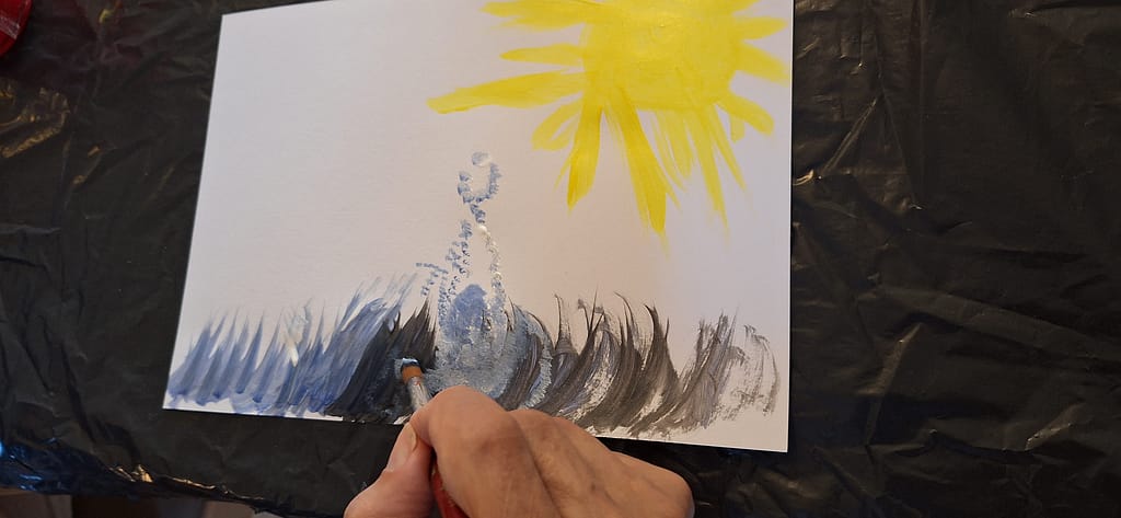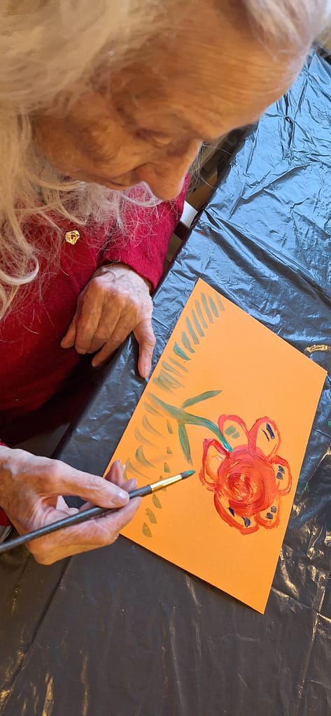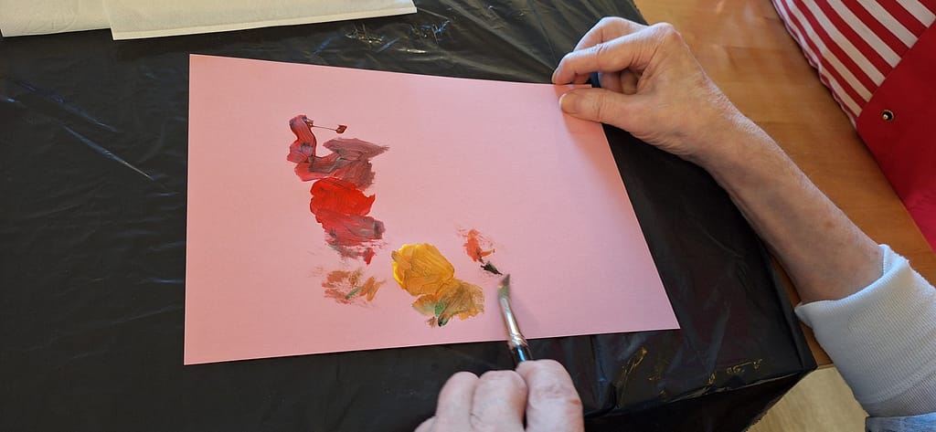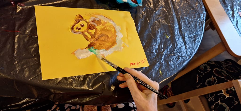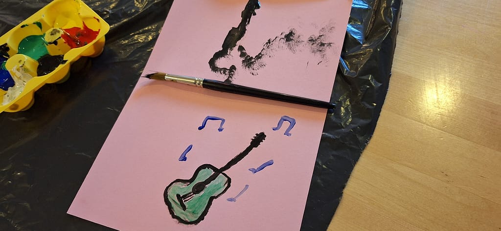 Tämän viikon ohjelmassa oli musiikkimaalausta. Aluksi saattoi tuntua, ettei maalauskartongille synny mitään, mutta musiikin ja pienen ohjauksen avulla kaikki saivat upeita teoksia maalattua. Jos siveltimen pitäminen kädessä oli hankalaa, saattoi pitää sivellintä yhdessä ohjaajan kanssa ja maalaminen onnistui mainiosti.