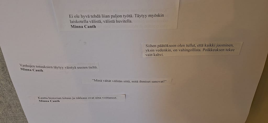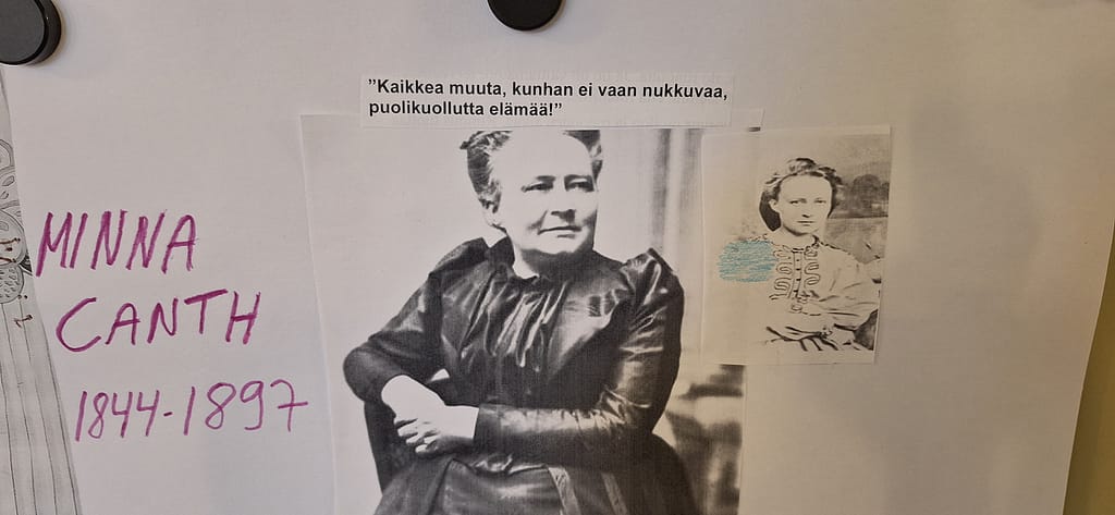 Minna Canthin päivänä muisteltiin Canthin teoksia ja saavutuksia, sekä luettiin ääneen hänen sitaattejaan ja pohdittiin niiden merkitystä. Minnan kuva ja valikoidut sitaatit pääsivät koristamaan ryhmäkotien seiniä. Kuunneltiin myös katkelma Canthin näytelmästä Kauppa-Lopo.