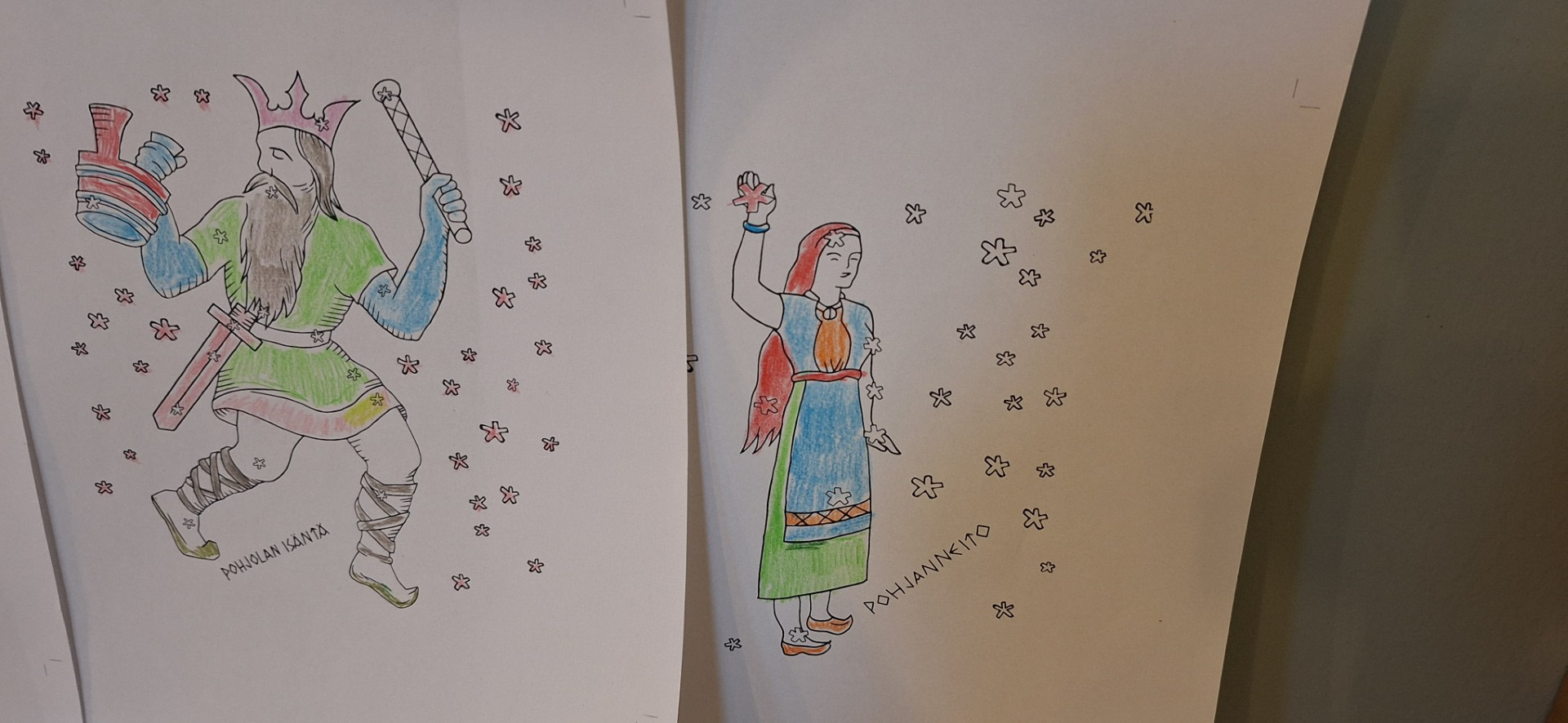 Kalevalan päivään valmistauduttiin värittämällä kalevalaisia hahmoja. Jos olisit kalevalainen hahmo, kuka olisit? Mukana värittämässä oli pieni ystävä. Mikäs sen mukavampaa!