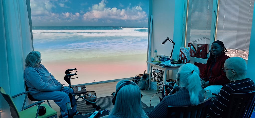 Aistihuoneen seinään heijastettiin musiikkiin sopivia kuvia ja videoita. Eino Grönin La Paloma hitin tunnelmaa siivitti merimaisema.