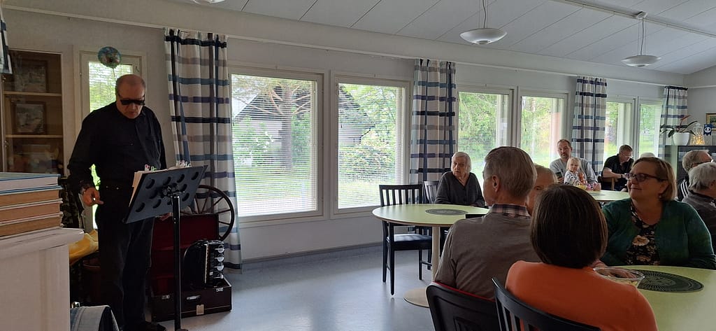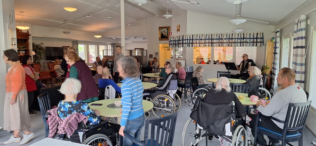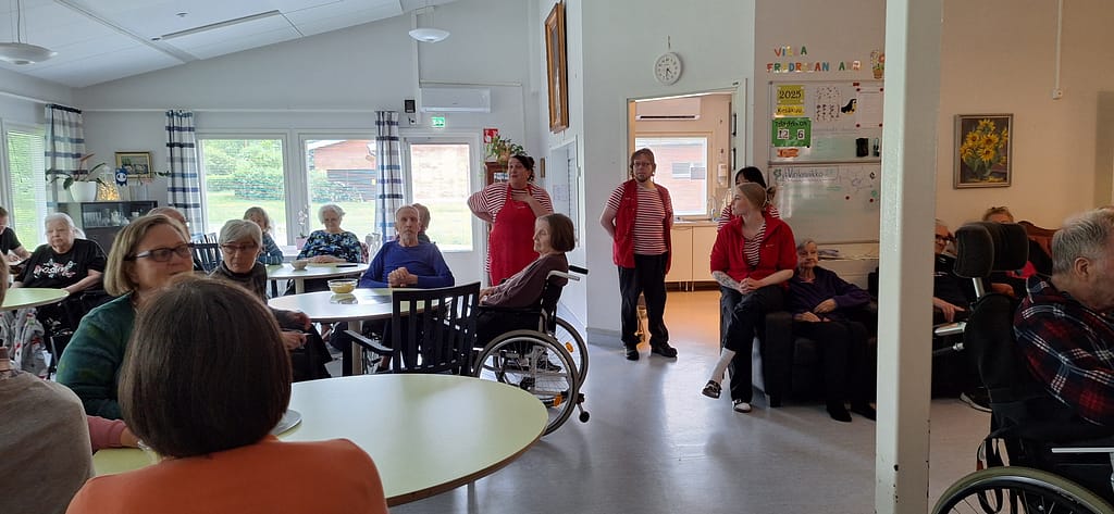 Asukkaat viettivät paikalle saapuneiden omaisten kanssa kivaa kesäjuhlaa torstaina 12.6.2025. Tarkoitus oli olla terassilla grillaamassa ja nauttimassa musiikista sekä kesän lämmöstä. Sateen sattuessa päädyimme kuitenkin viettämään juhlat sisätiloissa. Juhlassa esiintyi Heikki Salama.