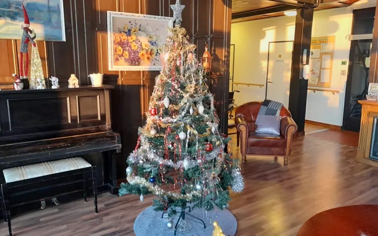 Tänään saliin ilmestyi joulukuusi. Joulukuusen valot ja kimaltavat koristeet näkyvät koko päiväsaliin nykyisestä sijainnistaan.