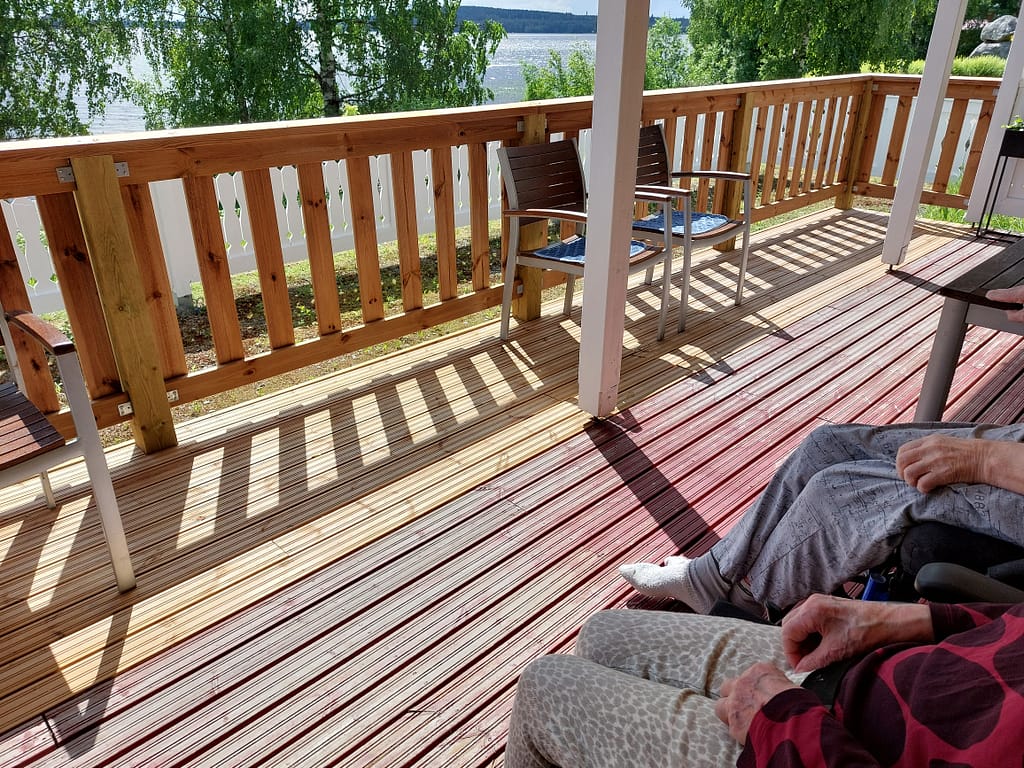 Juhannuksen alla vietimme grillijuhlia takaterassillamme asukkaiden kanssa. Grillasimme makkaraa ja joimme päiväkahvit ulkona jäätelön kera.
