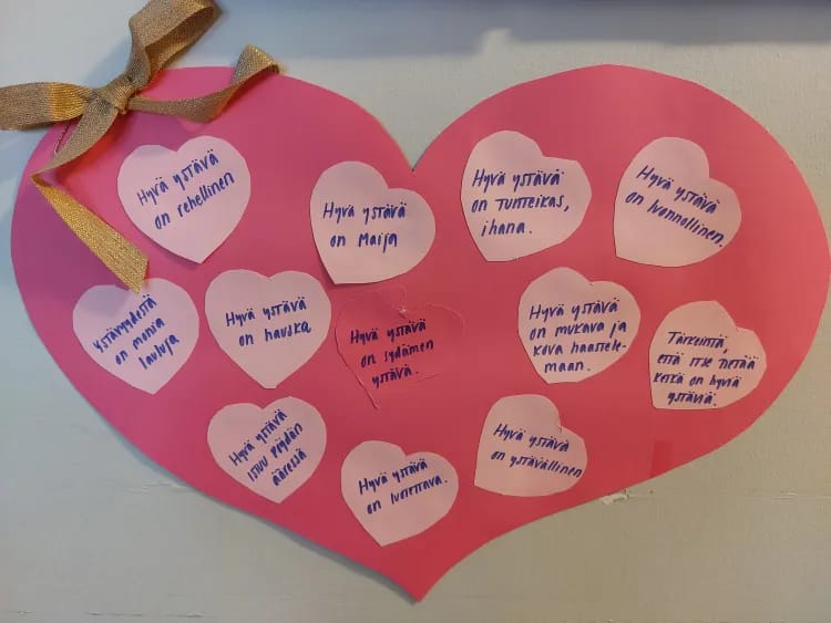 Esperi hoivakoti Tuulettaressa vietettiin ystävänpäivää iloisissa tunnelmissa. Askartelimme asukkaiden kanssa leikkelemällä kartongista sydämiä ja pohdimme yhdessä ajatuksia ystävyydestä. Kokosimme sitten kaikki ajatukset seinälle.