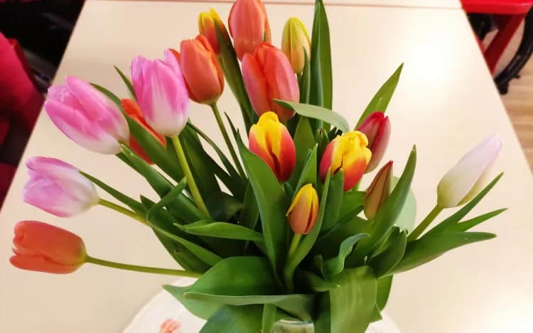 Värikkäät tulppanit tuovat iloa ruokasalin pöydissä.