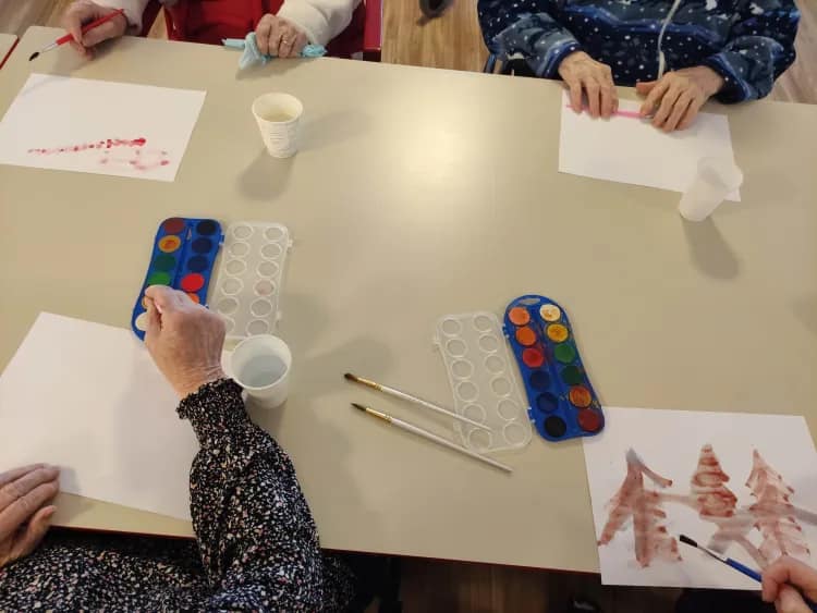 Asukkaat maalasivat vesiväreillä ennen ruokailun aloittamista. Joku taisikin maalata usean maalauksen ja toinen halusi hoitajan maalavaan puolesta. Kotimökki oli yleinen aihe taideteoksissa.