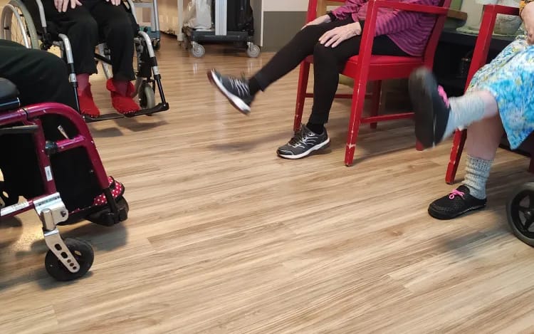 Sunnuntaina keräsimme porukkaa kasaan ja jumppasimme yhdessä. Musiikin tahdissa venytysliikkeet sujuivat kuin tanssi. Myös kappaleet olivat asukkaille tuttuja ja taisipa joku laulaa mukanakin.
