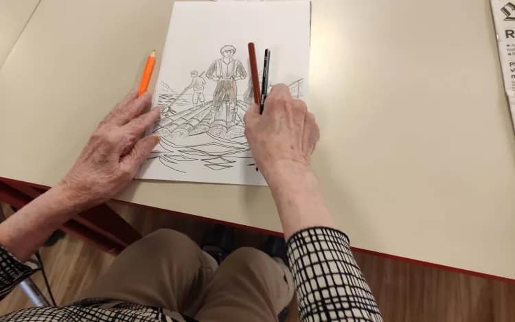 Asukkaat värittivät kuvia salissa lounaan jälkeen.