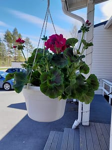 Pääsimme jo kahvittelemaan ulos terassille. Ihailimme kauniita pelargonioita.