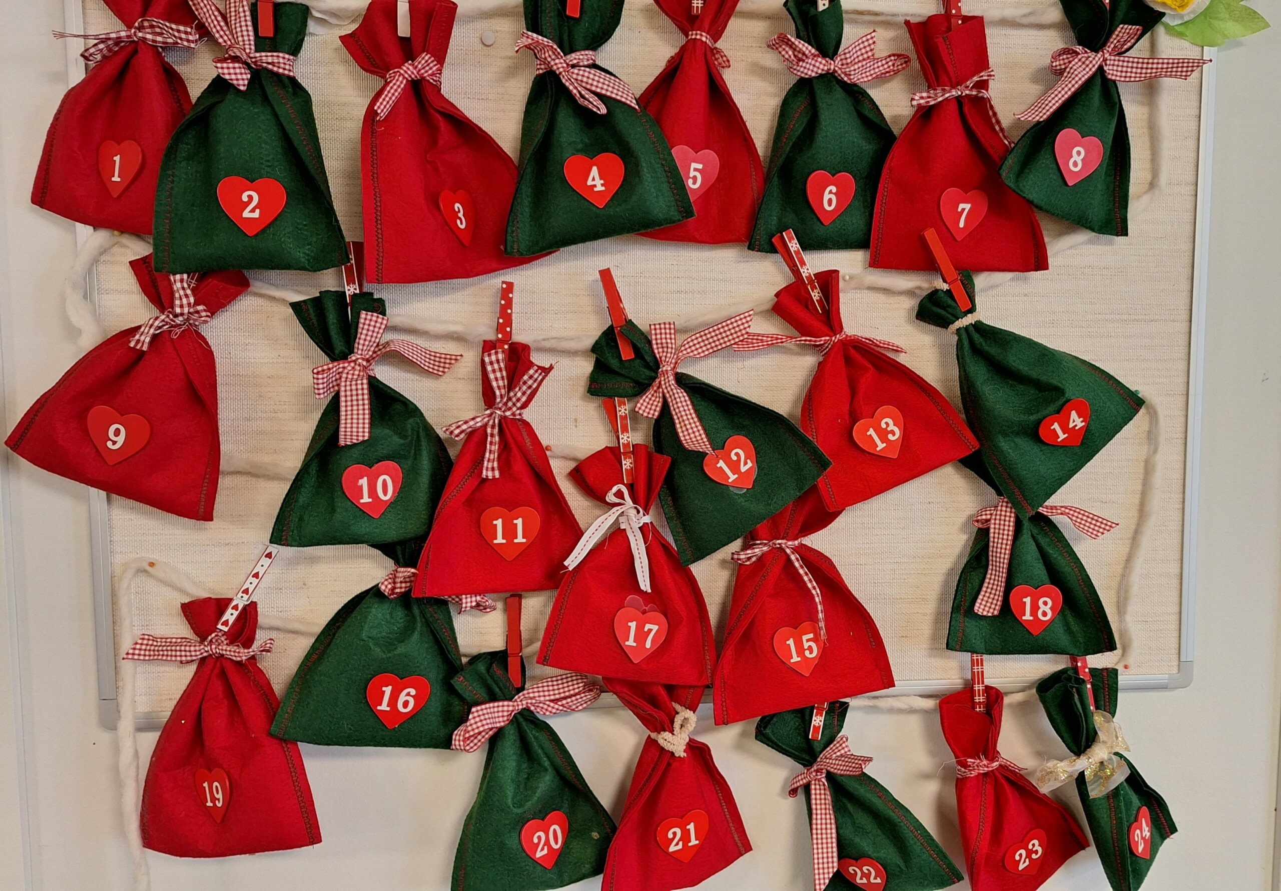 Meidän kodin seinälle oli viikonlopun aikana ilmestynyt ensimmäisen adventin kunniaksi joulukalenteri. Pussit sisältävät erilaisia jumppia, yhteislauluja, runoja jne. ☺