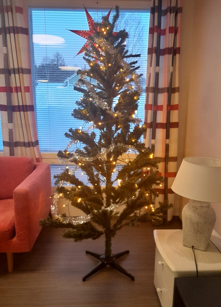 Meille ilmaantui kaksi joulukuusta, jotka pääsivät koristamaan talon kummankin puolen päiväsaleja ja tuomaan kotiimme joulun tuntua. Asukkaat koristelivat kuuset näteiksi. Nyt sitten vaan odotellaan, ilmaantuuko kuusen juurelle lahjoja.. ☺