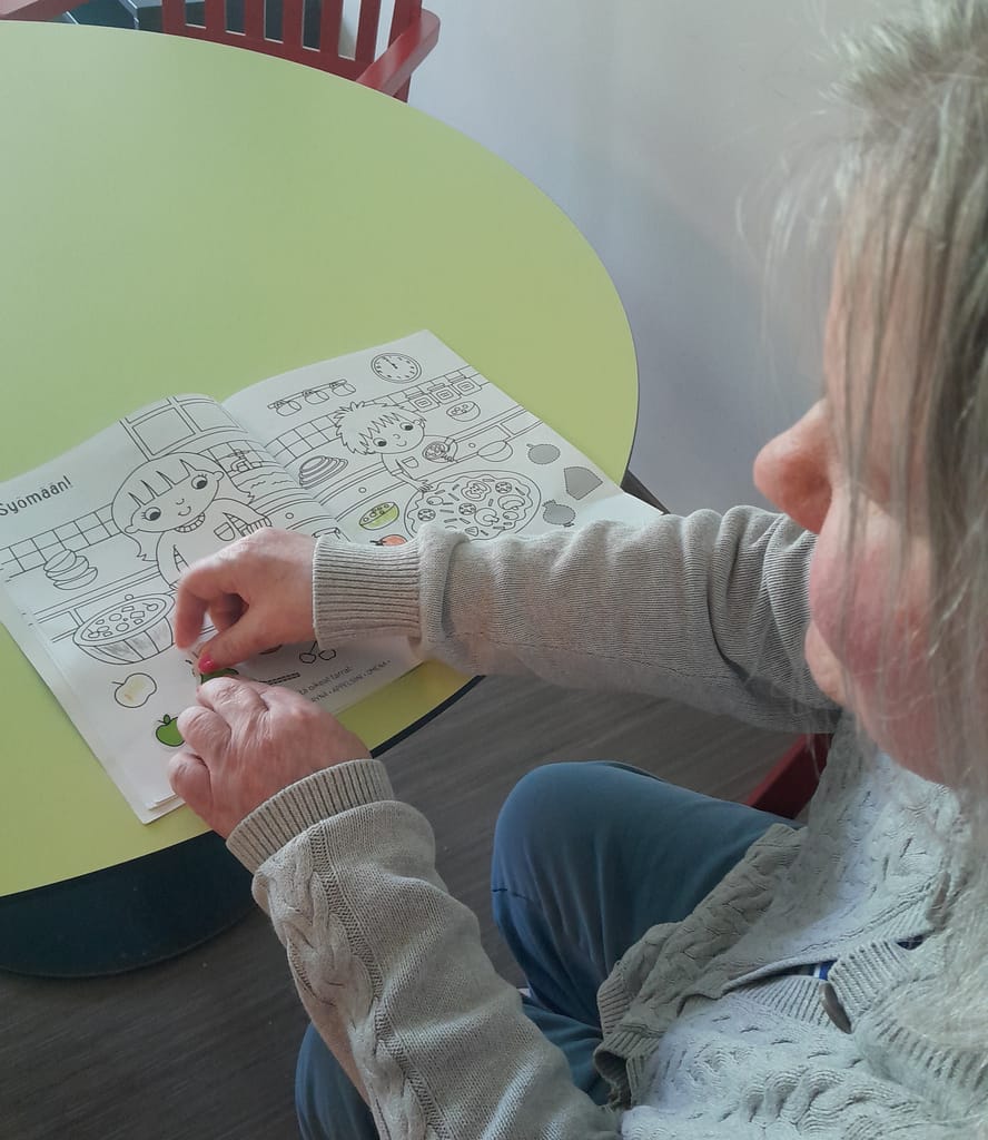 Tänään hoidettiin kesäkukkia asukkaiden kanssa. Kukat kaipasivatkin jo vettä. Myös kuihtuneita kukkia oli kertynyt nypittäväksi. Viriketuokiossa asukkaat pääsivät tekemään tarratehtäviä.