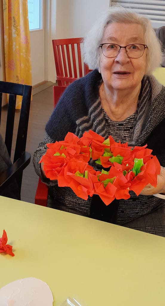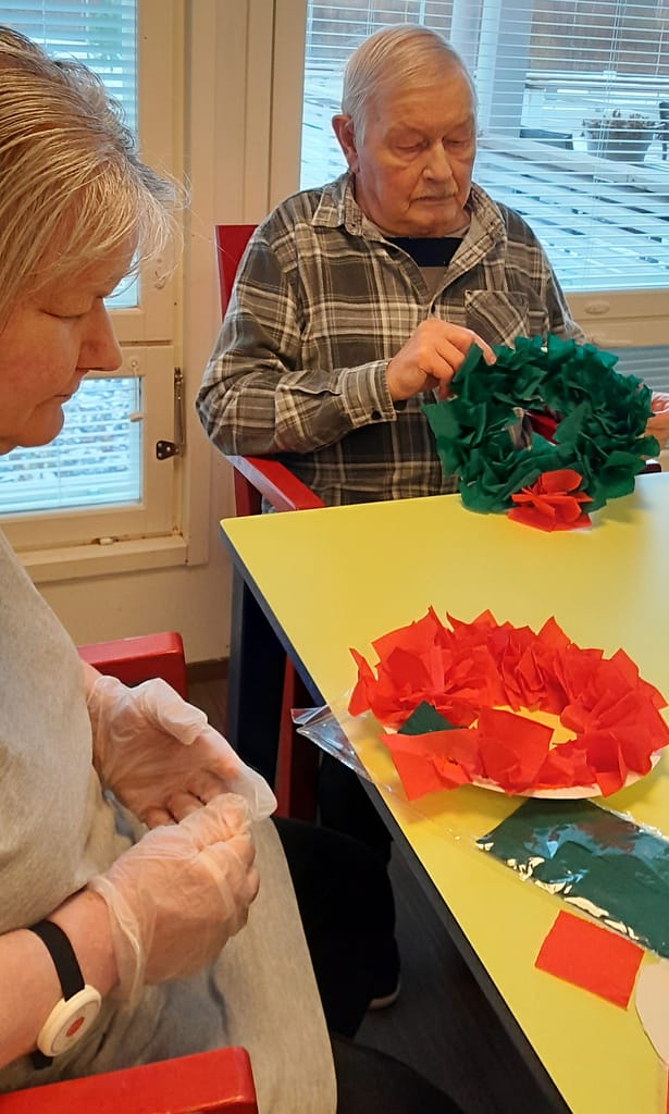Tämän päivän viriketuokiossa askarreltiin kransseja hoitajan avustuksella. Kranssien värit sopivatkin hyvin loppuvuoden tuleviin teemoihin.