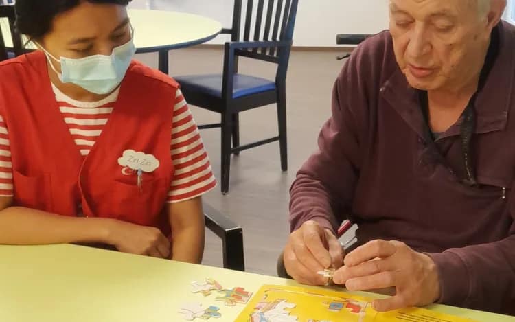 Ennen lounasta viriketuokiossa puuhailtiin asukkaiden kanssa heille mieleisiä asioita. Osa halusi mm.pelata palapelejä, osa vaihtaa kuulumisia. Myös motoriikkapeliä kokeiltiin.