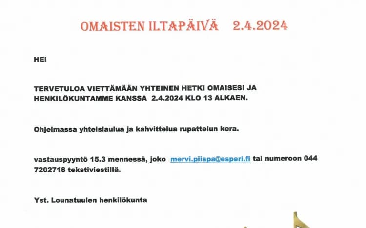 Kutsumme sinut 2.4. klo 13 alkaen viettämään kanssamme omaisten iltapäivää rennoissa tunnelmissa. Lauletaan yhdessä ja vaihdetaan kuulumisia kahvikupin äärellä. Tervetuloa!