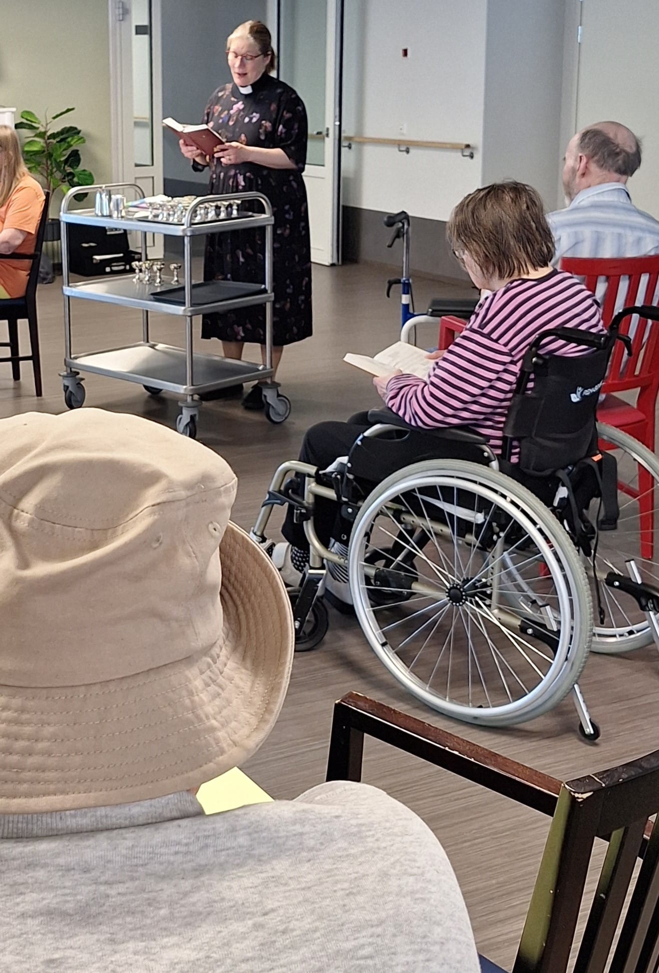 Seurakunnan pappi piti asukkaillemme ehtoollishartauden. Tuttuun tapaan ensin kuunneltiin papin puhe, laulettiin virsiä ja rukoiltiin yhdessä. Tämän jälkeen kaikki halukkaat saivat ehtoollisen.