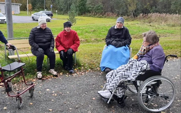 Tänään kävimme ulkona reippailemassa heti aamupalan jälkeen. Sää ulkona oli syksyisen raikas, pilvinen ja hieman tuulinen. Kahden viikon kestävän kampanjan aikana kaikki asukkaat ovat päässeet ainakin kerran ulos, osa useamminkin. Vanhustenviikon avajaispäivää vietetään tänään samalla kakkukahvien merkeissä.