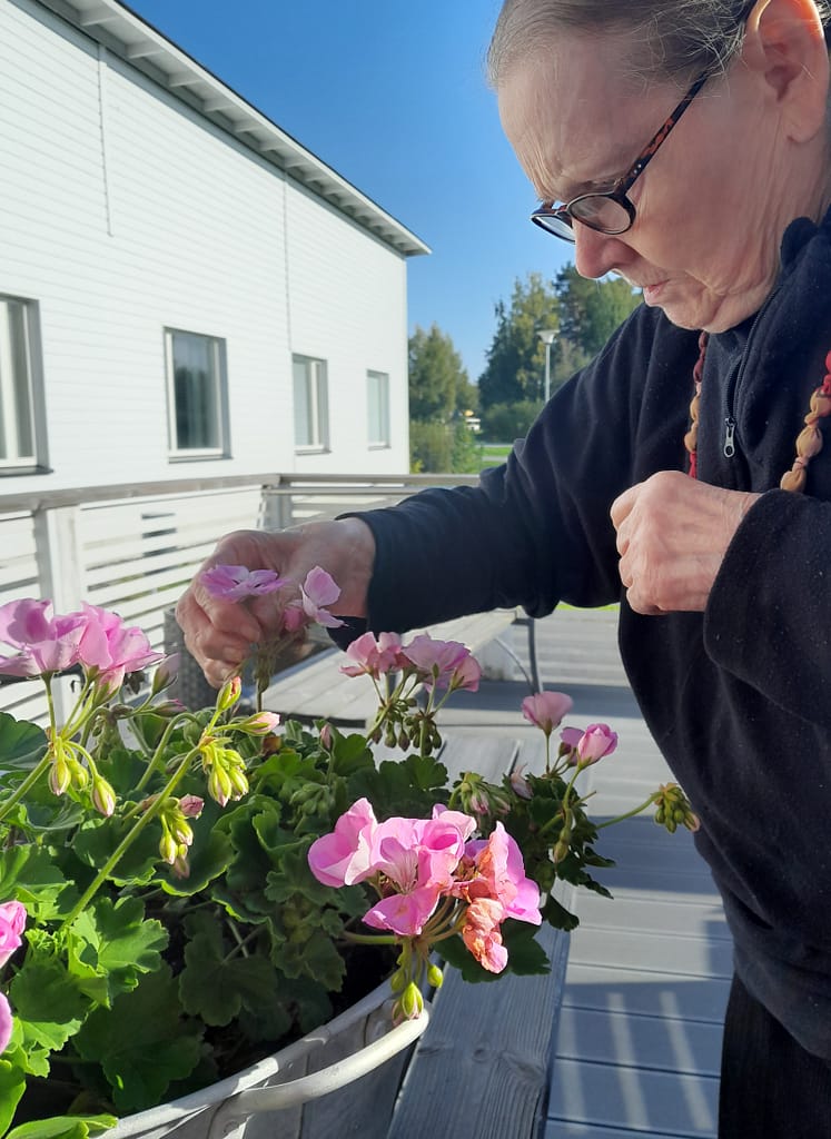 Ikäinstituutin vuosittainen Vie vanhus ulos -kampanja pyörähti tänään käyntiin meidänkin kodissa. Pihalla vietettiin yhdessä paljon aikaa mm. lenkkeillen ja istutuksia hoidellen. Osa taas halusi pelkästään nauttia viimeisistä lämpimistä kesäpäivistä pihakiikussa istuen, maisemia katsellen.