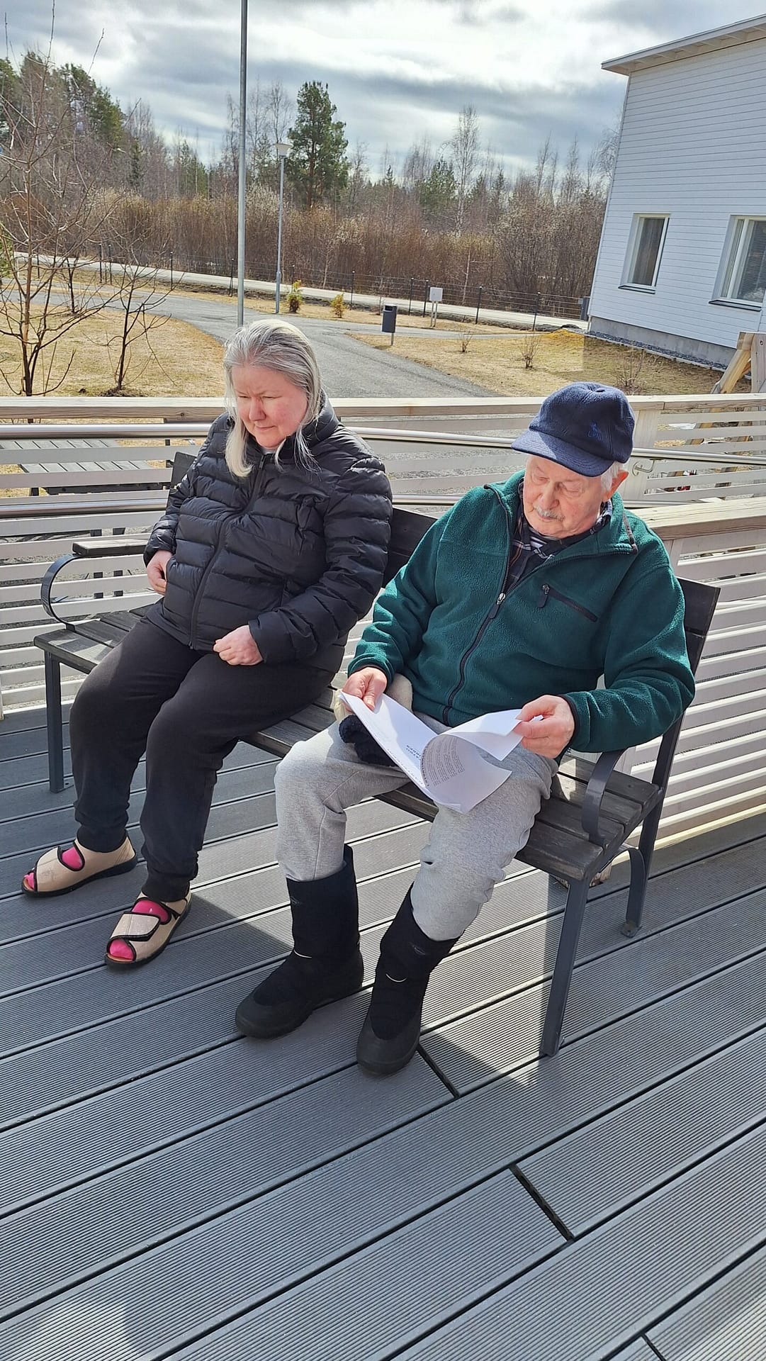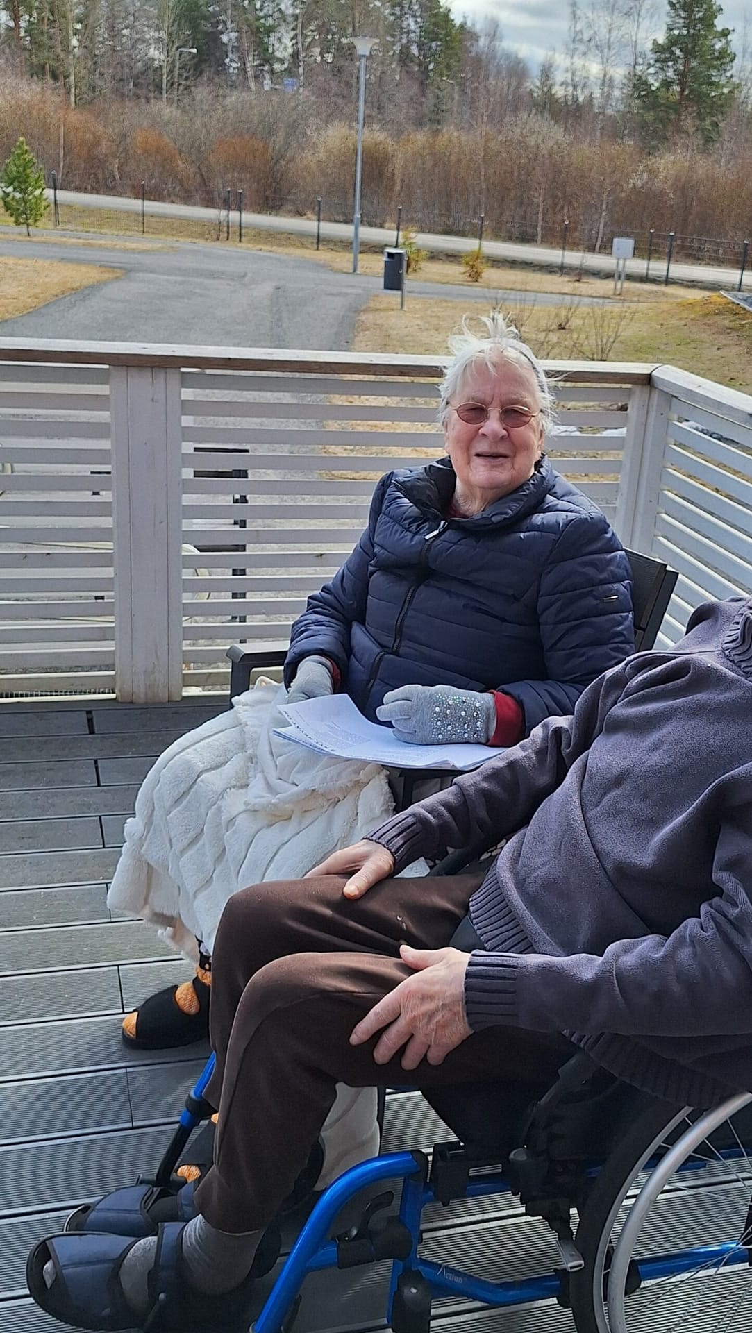 Hoitajamme järjesti lounaan jälkeen asukkaillemme laulutuokion pihamaan puolella. Vaikka sää oli tänään hieman tuulinen sekä pilvinen, tarkeni terassilla hyvin lauleskella kun vaatetus oli kunnossa. ☺