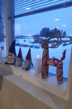 Jouluntunnelmaa luovat koristeet. Olkipukki onkin monelle tuttu, mutta myös tontut ovat tervetulleita kurkkimaan ikkunalle. Lunta on runsaasti iltapäivän sininen hetki on kaunista katseltavaa