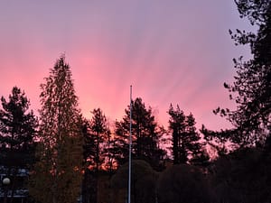 Aamulla Elvi sanoi minulle aamupalapöydässä istuessa, että katsohan tuonne taivaalle. Kaunis pinkin väri oli maalannut aamuisen taivaanrannan.