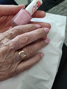 Eräs rouvamme oli innoissaan, kun omaiset olivat tulossa häntä hakemaan reissuun. Lakkasimme odotellessa kynnet niin hän pääsi hienona matkaan.