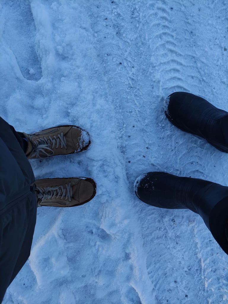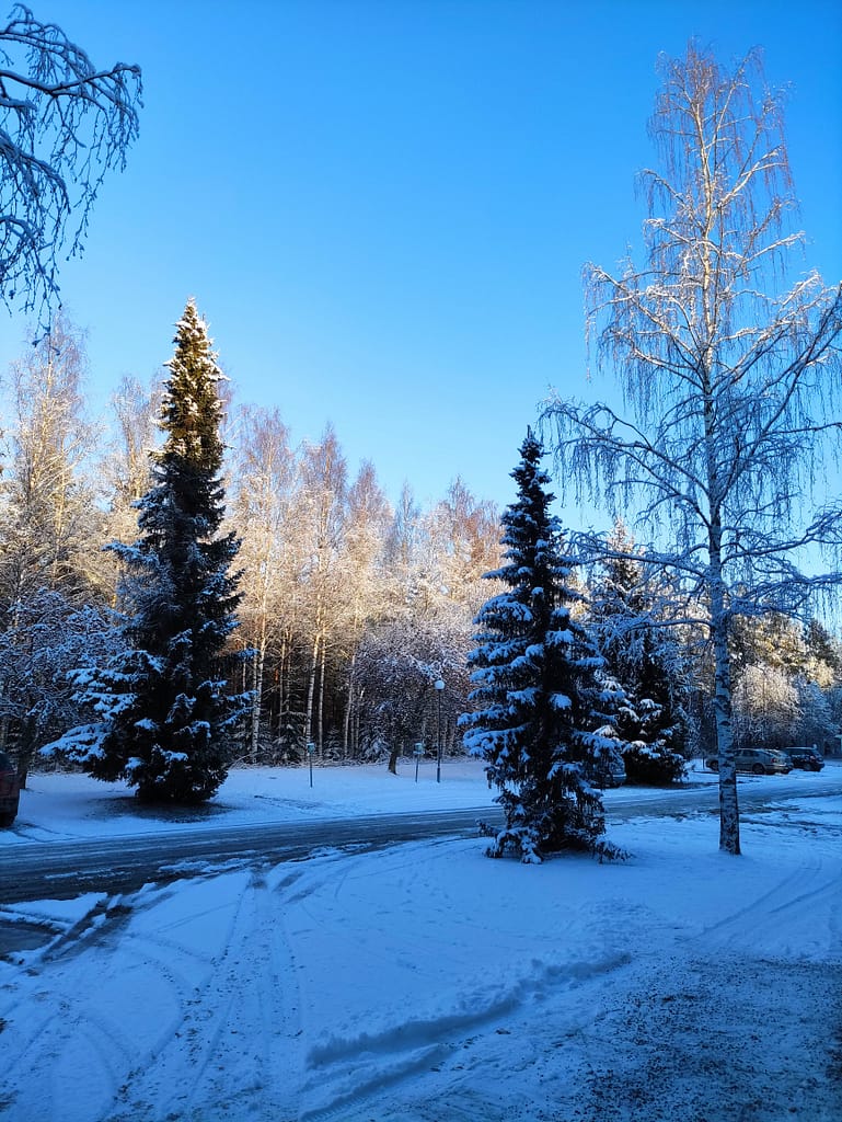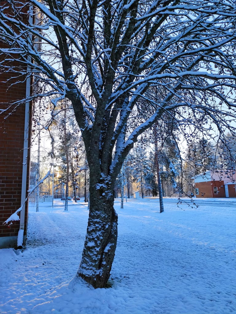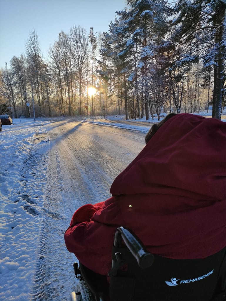Pitkän pimeän jakson jälkeen maa on taas valkoinen ja aurinkokin näyttäytyi. Ulkoiluilma lähes kohdillaan pakkasesta huolimatta.