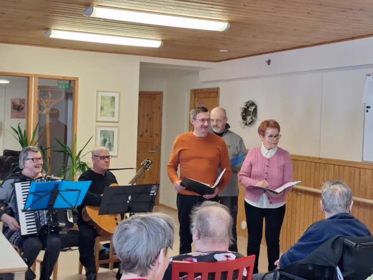Vieraita laulamassa ja laulattamassa asukkaita. Kaikki viihtyvät.