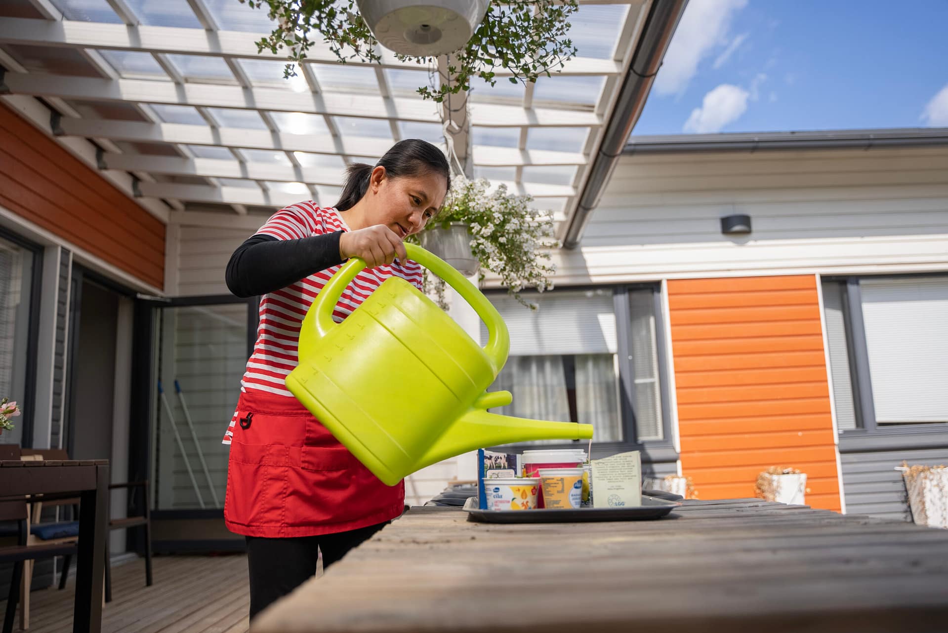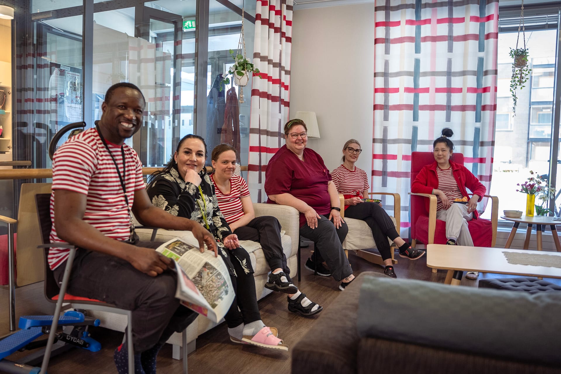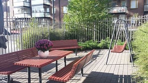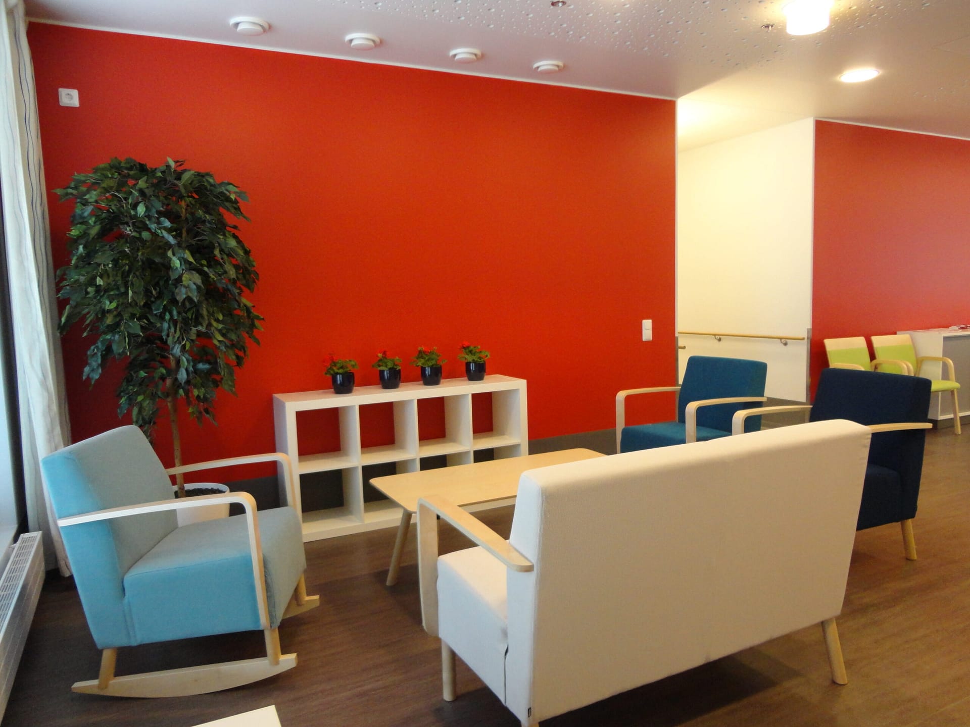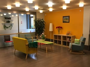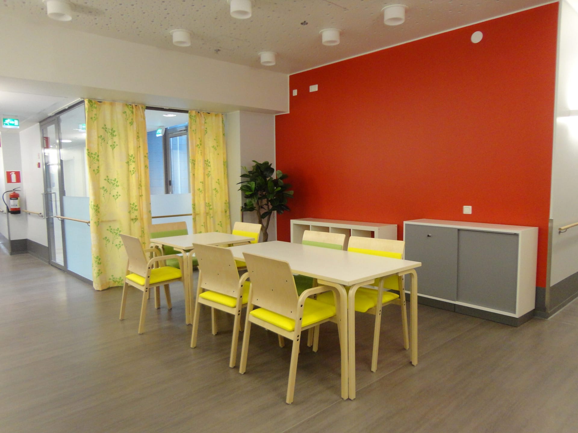 Tilojen sisutuksessa on huomioitu myös kodinomaisuus – runsaat värit tuovat iloa asukkaille! Yhteiset ruokailu- ja seurustelutilat ovat esteettömät ja ulottuvat aina rajatuille sisäpihoille asti. Turvallinen piha-alue mahdollistaa ulkoilun myös apuvälineiden kanssa.