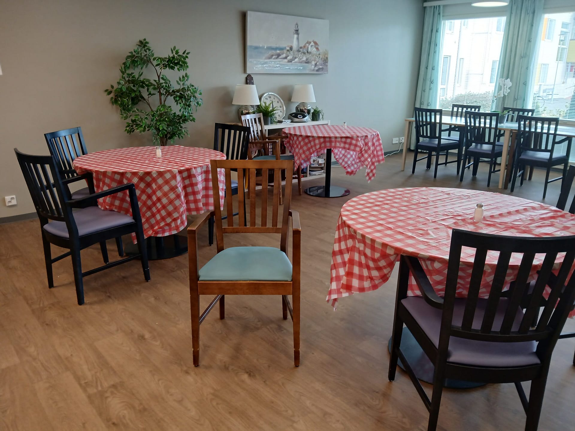 Pöydät koristeltiin teemaan sopiviksi. ”Kyllä on sitten hienon näköistä”, tokaisi asukkaamme.