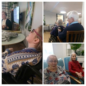 Tuttuja lauluja laulettiin yhdessä. Laulut herättivät paljon muistoja. Osalla muistot saivat silmäkulman kostumaan. Tässä tärkeässä hetkessä muutamalla asukkaalla oli mukana omainen.