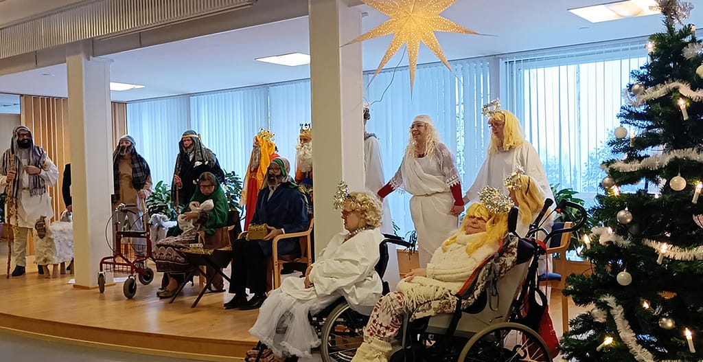 “Käytämme arkityössämme muulloinkin työvälineinä paljon draamamenetelmiä. Jouluseimiesityksen käsikirjoitus mukailee Raamatun joulukertomusta, jonka selkokielinen versio löytyi helposti netistä“, kertoo yksikönpäällikkö Anita Kononen. “Hieman muuntelemalla teimme siitä asukkaillemme sopivan“.