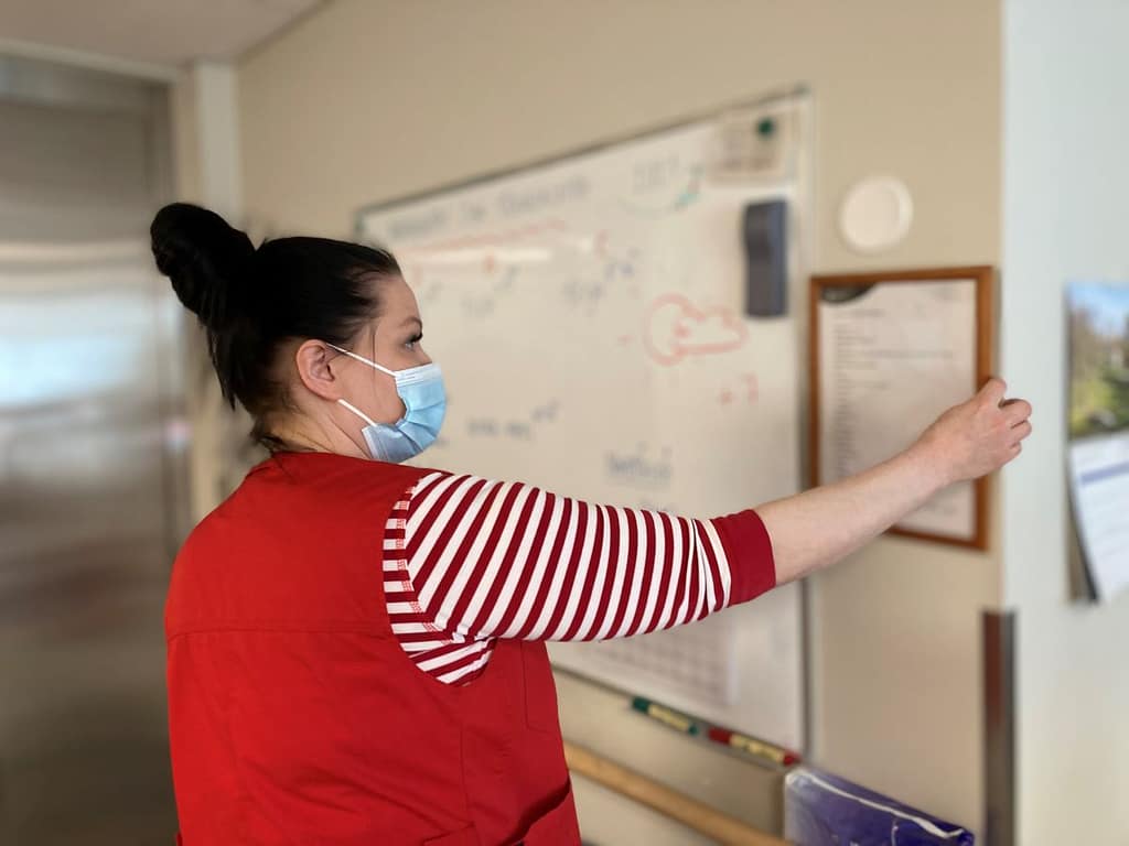 Kuvassa: Teija Kälkäinen vastaa Oulussa sijaitsevassa Hoivakoti Ainolassa kodin viikoittaisesta toiminnan suunnittelusta. Viikko-ohjelma on nähtävillä kodin seinällä. Välillä kodissa vaihdetaan suunnitelmaa lennosta, ja eletään hetkessä.