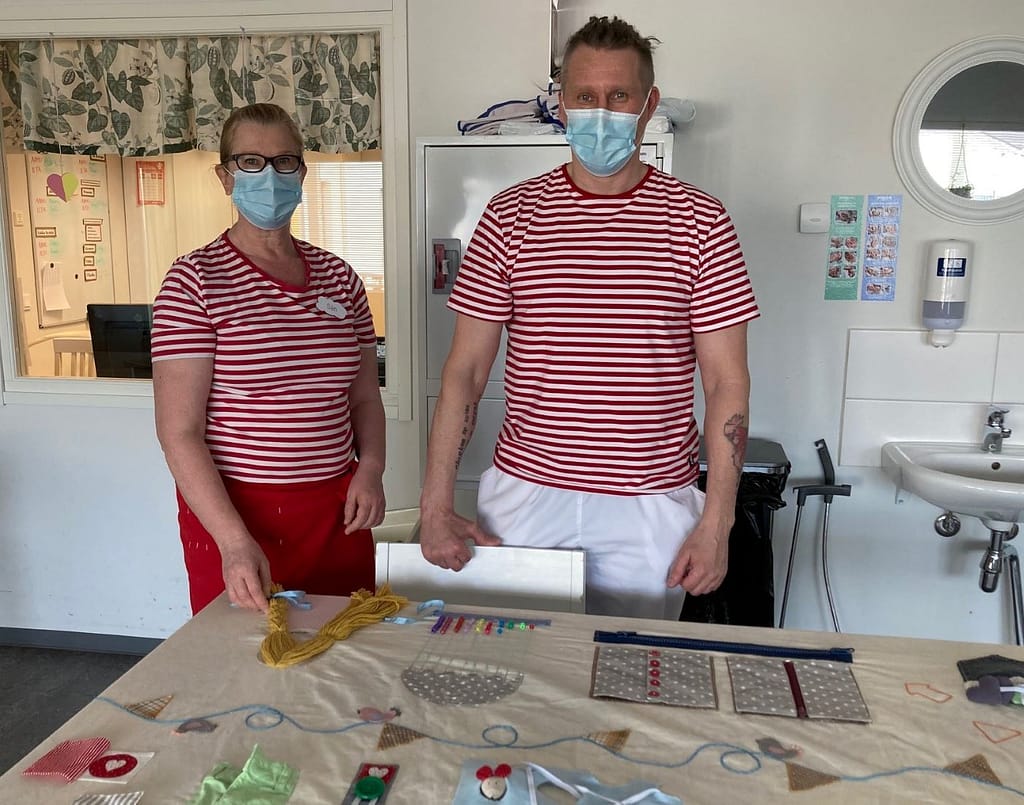 Esperin Hoivakoti Santaholman iäkkäillä muistisairailla on käytössä aktiivipäiväpeitto: pöydän päälle aseteltava kierrätysmateriaaleista valmistettu kangas, jossa on jos jonkinnäköistä sorminäppäryyttä vaativaa tekemistä.