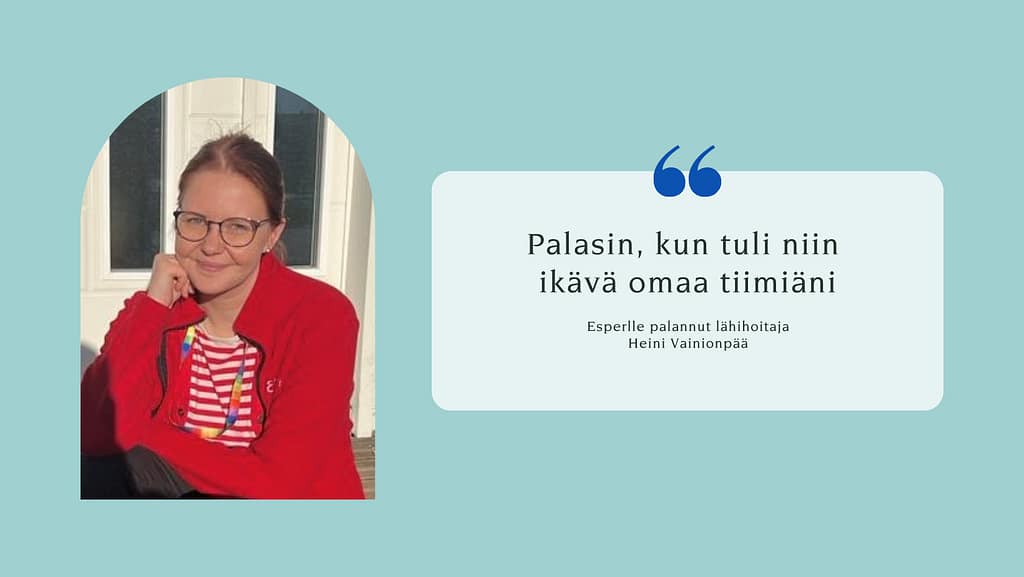 Heini aloitti Esperi Koti Helmessä lähihoitajana vuonna 2017. Pitkä työmatka rupesi mietityttämään, ja hän vaihtoi uuteen työhön lähemmäksi kotiaan vuoden 2022 lopussa. Takaisin Helmeen Heini palasi jo muutaman viikon jälkeen.
