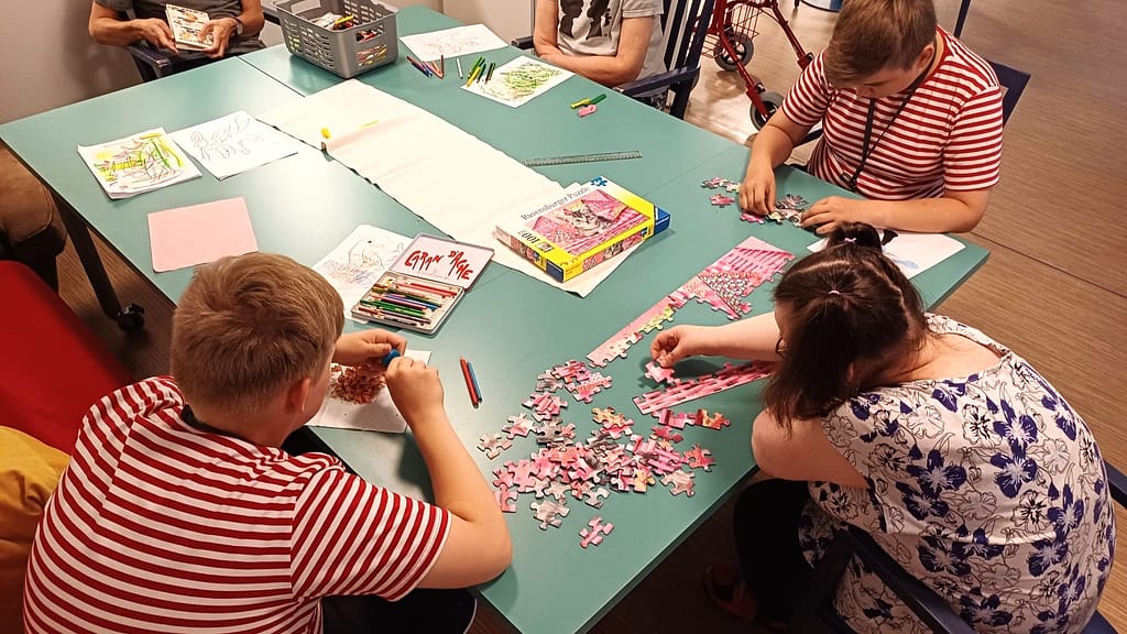 ”Asukkaita Pajusirkussa on nuoria ja vähän vanhempia, meidän ikäisiä kehitysvammaisia Pajusirkussa ei ole lainkaan. Heistä osan kanssa voi keskustella, mutta osalle riittää vain, että pidämme heille seuraa tai puhelemme mukavia asioita, vaikka vastausta ei heiltä kuulukaan”, Jesse kertoo.