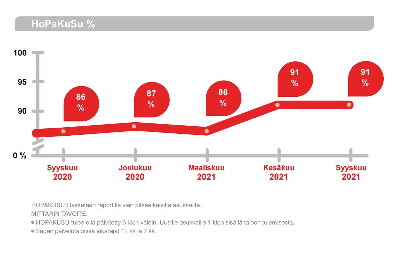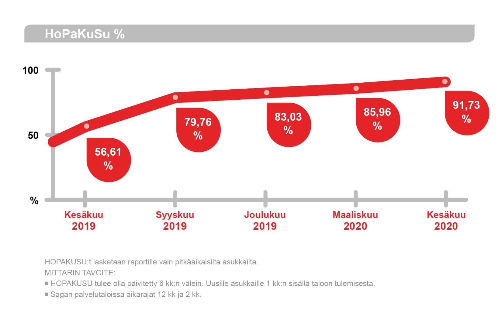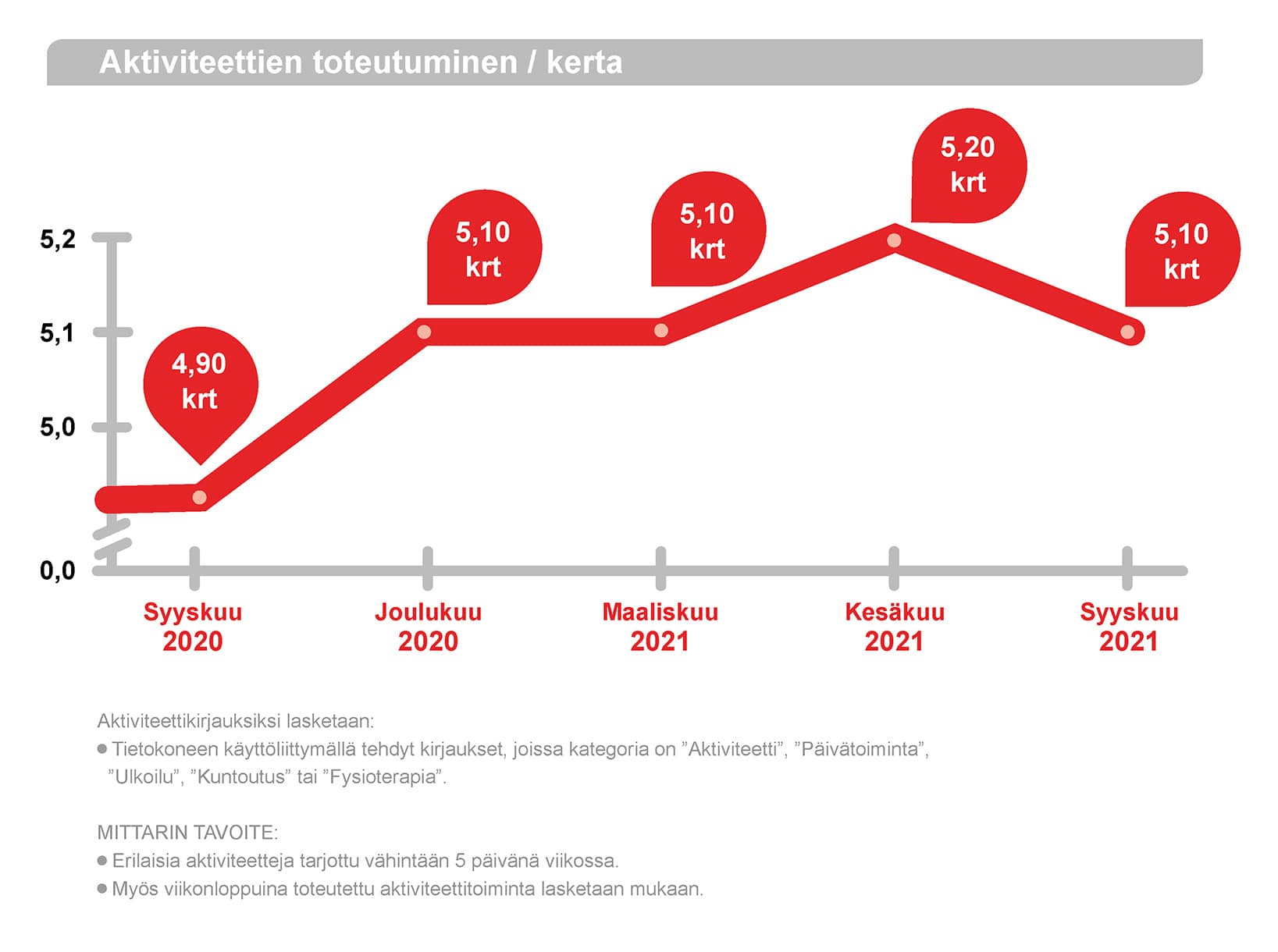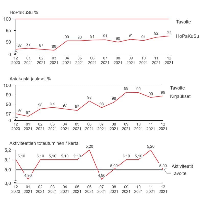 Mittariston ensimmäinen osa otettiin käyttöön vuoden 2019 alkupuoliskolla ja se kehittyy koko ajan. Kaikki avainmittarimme (KPI) ovat parantuneet vuosi vuodelta ja erityisen ylpeitä olemme siitä, että kodeissamme asukkaille tarjottuja aktiviteetteja on yli 5/vko ja se ylittää asetetun tavoitteen.