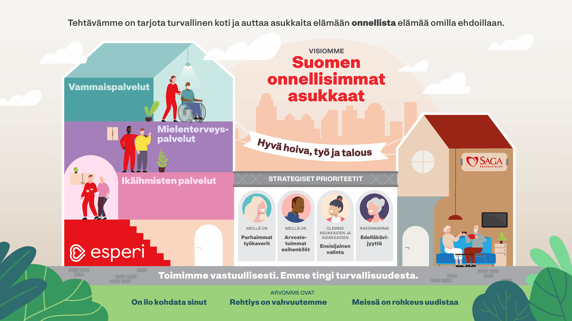Liiketoiminnassaan Esperi-konsernilla on kaksi selkeästi erilaista kokonaisuutta: Esperi ja Saga. Niitä kuvataan strategiassamme erillisinä taloina.