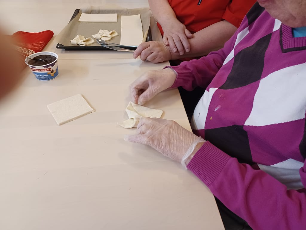 Joulu alkaa tuoksuista ja meillähän on leivottu torttuja ja pipareita. Näppärästi tortut saivatkin mallinsa. Asukas kertoi että äiti oli opettanut joulutortun teon. Ohjaaja kun teki viillot erilailla kun asukas oli oppinut äidiltä, niin heti kertoi että miten ne on tehty ennen. Tässä kuvassa asukas näyttää miten hän on tehtyt ennen. Eli keskeltä kulmaa viilto ja siivekkeet keskelle