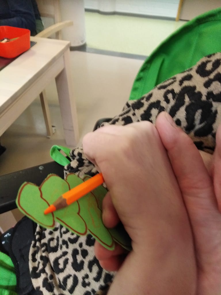 Vaikka ilman apua ei pysty askartelemaan, niin silloin ohjaajan auttava käsi tulee apuun. Tässä asukas ja ohjaaja yhdessä värittää joulukorttia