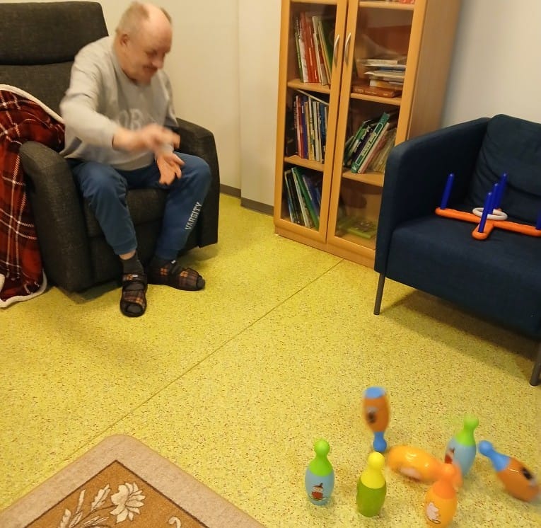 Toiset istualtaan nojatuolilta, joku seisten ja myös pyörätuolistakin osallistutaan.