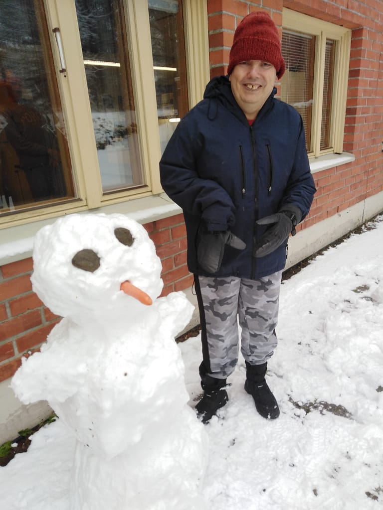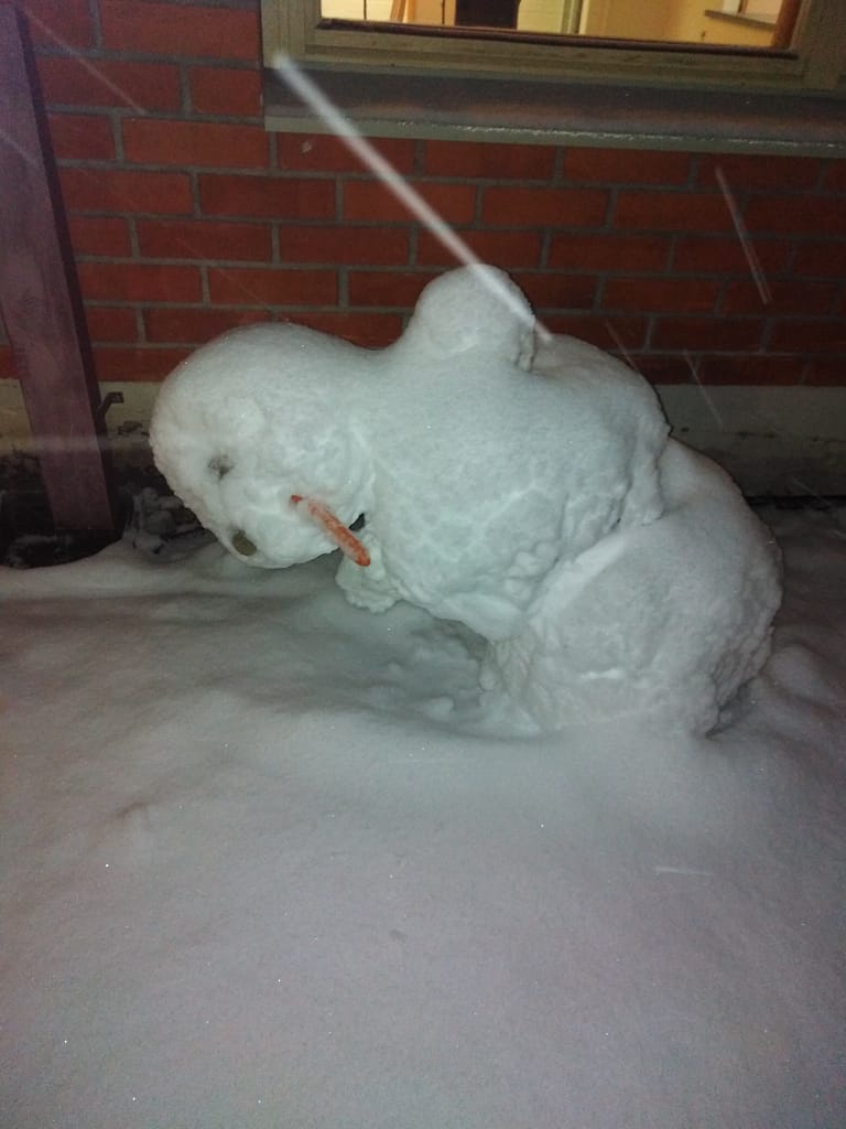 Niin lumiukko lopulta väsyi, kun räntää ja lunta kokoajan niskaan sai,